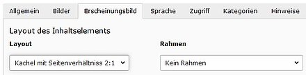 Eine Kacheleinheit besteht aus zwei Spalten. In einer Spalte können weitere Kacheleinheiten oder ein Inhaltselement untergebracht werden. Wird ein Inhaltselement eingefügt, so kann diesem das Kachelseitenverhältniss über die Layoutsauswahl zugewiesen werden.